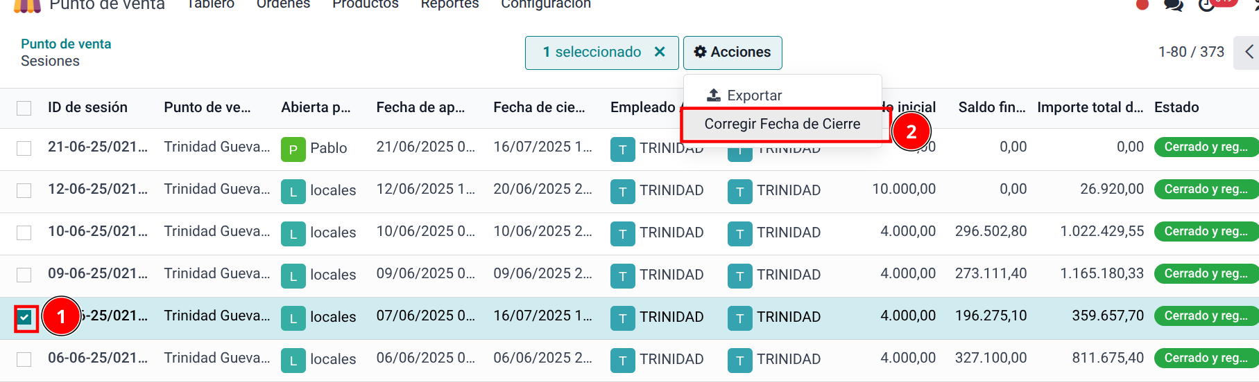 buscar la caja que abrimos y cerramos, tildarla, clickear en acciones y en corregir fecha de cierre