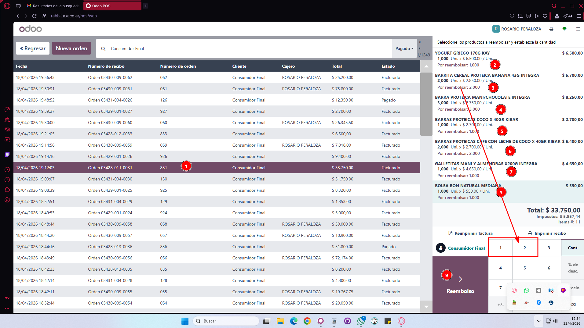 2, seleccionar una orden, luego se debe clickear en la orden, y luego en cada item que se desee reembolsar, hacer click en el item y ingresar la cantidad a reembolsar. puede reembolsarse toda la venta o solo algunos items. para reembolsar solo algunos items, ingrese cantidades en los items a reembolsar, si me equivoco hago click en el boton