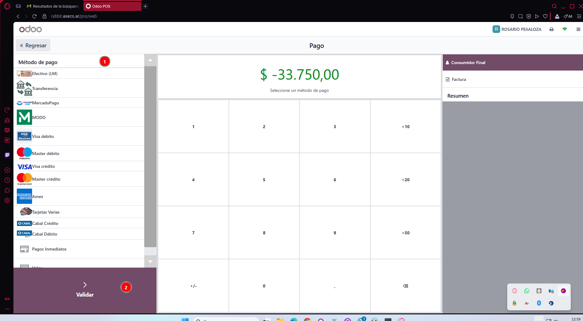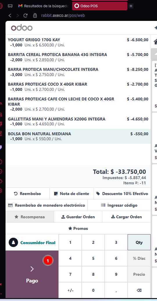 me aparece toda la venta pero el total en negativo, clickeo en pago